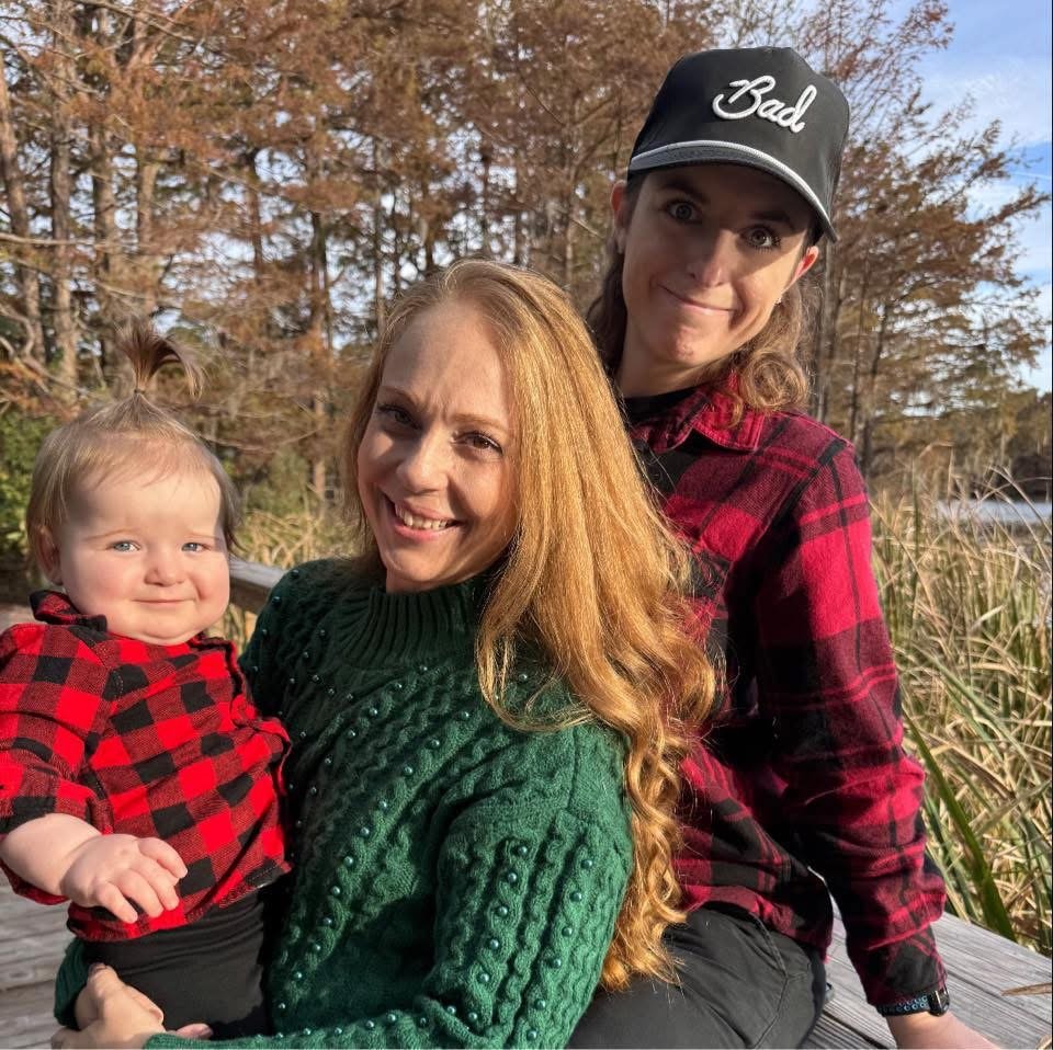 A woman, a man, and a young girl outdoors on a wooden platform near a lake and trees in fall. The woman has long red hair and is wearing a green sweater. The man has long curly hair, is wearing a red plaid shirt and a black cap with the word "Bad". The girl has light hair in a high ponytail and is wearing a red and black plaid shirt.